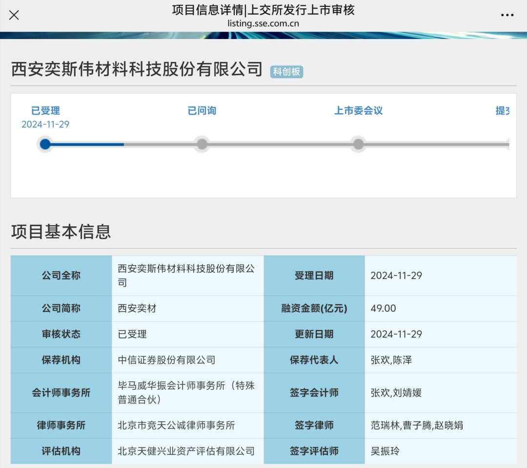 2024年11月29日,上交所官网知晓,西安奕斯伟材料科技股份有限公司(简称西安奕材)在科创板上市的肯求获上交所受理。