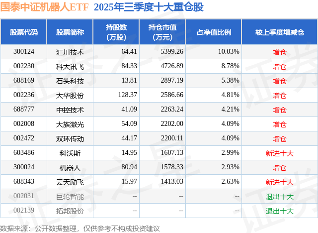 从基金范围来看,国泰中证机器东说念主ETF基金2025年三季度公布的基金范围为5.38亿元,较上一期范围3.54亿元变化了1.84亿元,环比变化了52.01%。该基金最新一期钞票建设为:股票占净值比99.49%,无债券类钞票,现款占净值比1.04%。从基金抓仓来看,该基金当季前十大股票仓位达49.94%,第一大重仓股为汇川技能(300124),抓仓占比为10.03%。